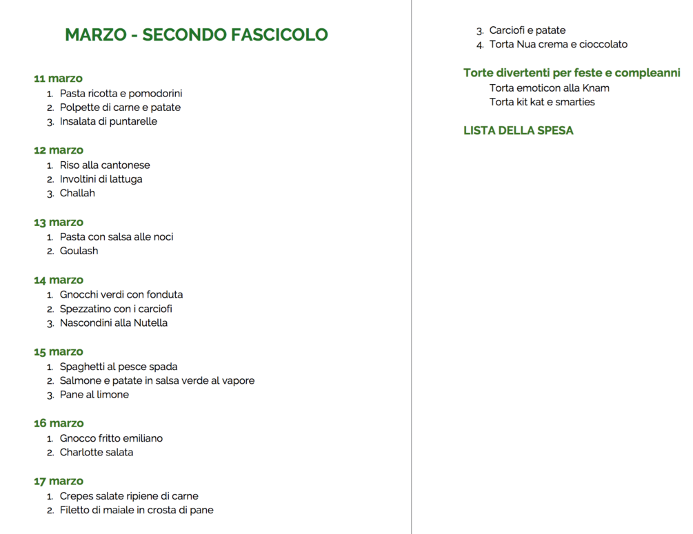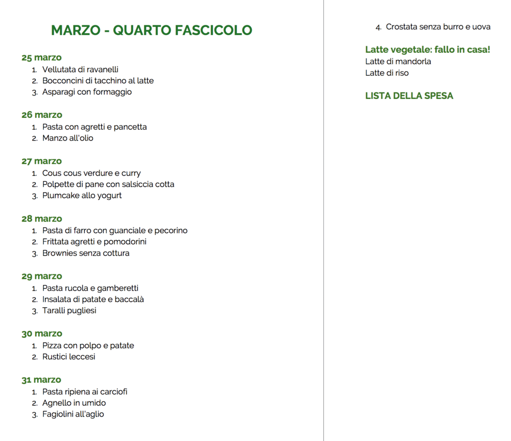 Il ricettario è organizzato in 4 fascicoli + una tabella che puoi stampare e usare per programmare i tuoi pasti.